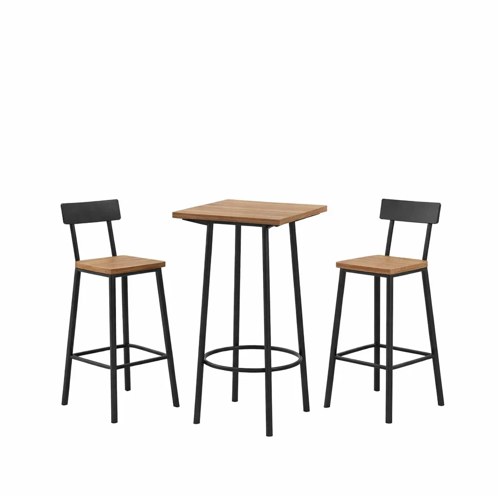 The set features a brown tabletop and seats, complemented by a black steel frame.