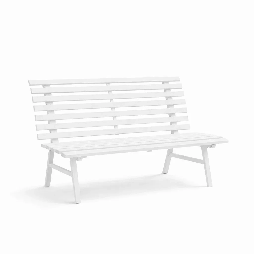 This bench features slatted design for both the back and seat, providing a functional outdoor seating option.